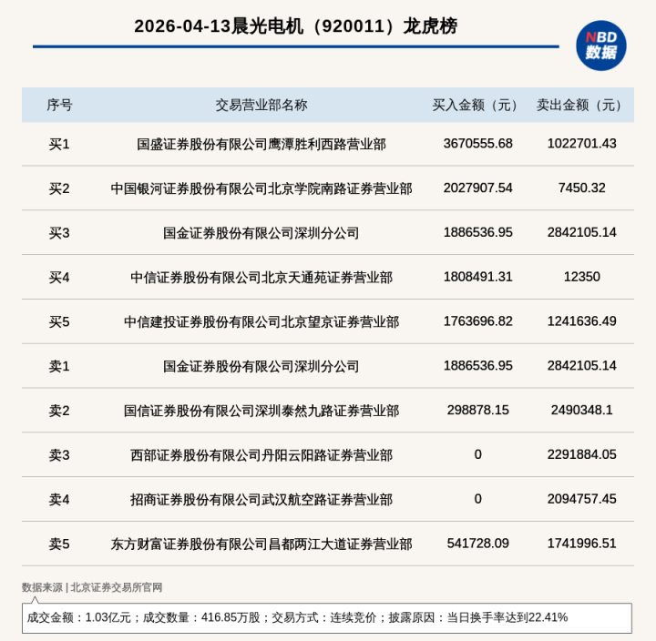 每经讯,2026年4月13日,北交所上市公司朝阳电机(920011,收盘价:24.82元)登上龙虎榜,往还方法是聚合竞价,滚球官网线路原因是当日换手率达到22.41%,成交数目416.85万股,成交金额1.03亿元。买一席位为国盛证券股份有限公司鹰潭成效西路商业部,买入367.06万元;卖一席位为国金证券股份有限公司深圳分公司,卖出284.21万元。