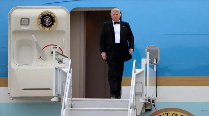 2017年5月4日,在好意思国纽约肯尼迪机场,好意思国总统特朗普走出专机“空军一号”。新华社记者王迎摄