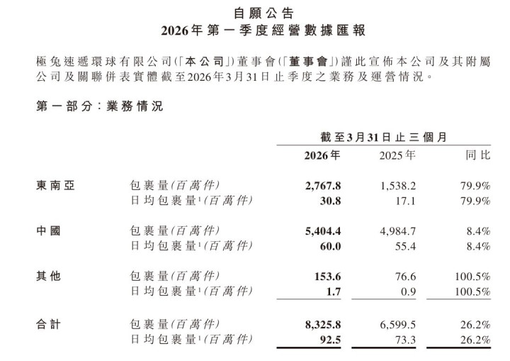 4月13日,极兔速递(01519.HK)公布了2026年第一季度业务数据。敷陈期内,公司专家包裹总量达到83.26亿件,同比增长26.2%,国外商场包裹量占比进步至35.1%,较上一季度提高了4.3个百分点。