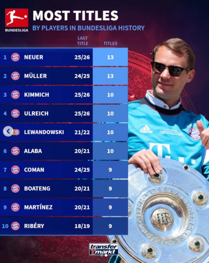 直播吧4月20日讯德甲第30轮比赛,拜仁以4-2的比分投降斯图加特锁定本赛季的德甲冠军,诺伊尔、基米希、乌尔赖希等东说念主再添一个德甲冠军奖牌。德国转会市集盘货了球员德甲获取德甲冠军的数目,滚球app诺伊尔和穆勒均拿到13个德甲冠军并排榜首,前10均为拜仁球员。