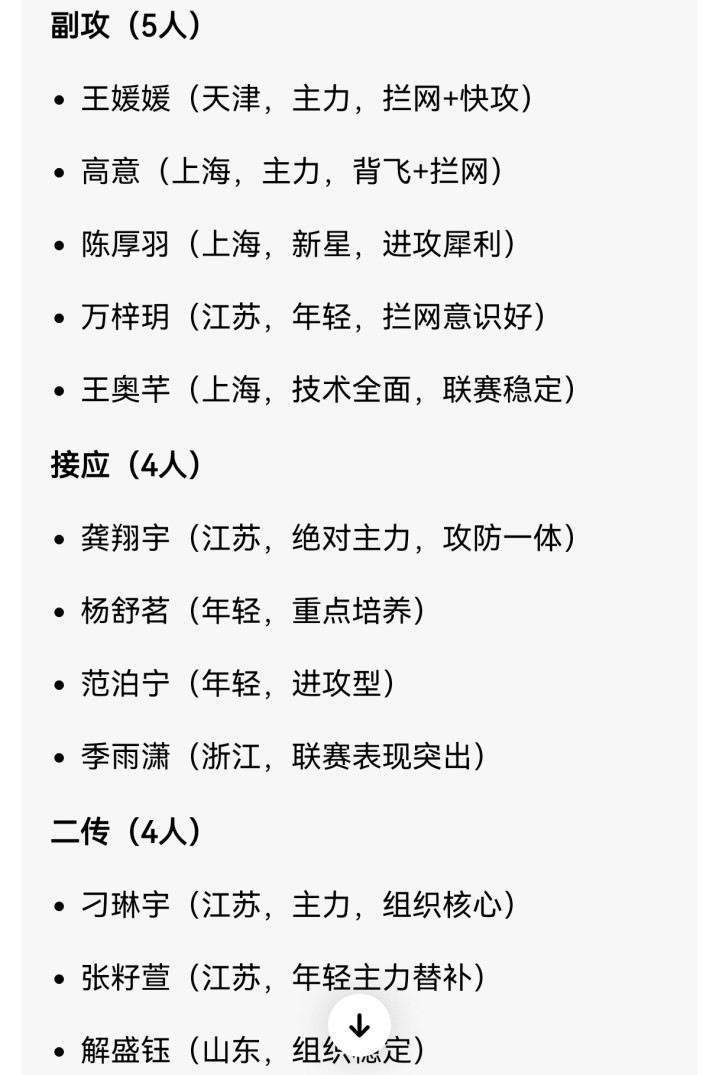 主攻位置7东说念主,区分是李盈莹、吴梦洁、庄宇珊、董禹含、唐欣、李晨瑄以及黄悦鑫。副攻5东说念主,区分是王媛媛、高意、陈厚羽、万梓玥和王奥芊。策应4东说念主,区分是龚翔宇、杨舒茗、范泊宁和季雨潇。二传4东说念主,区分是刁琳宇、张籽萱、解盛钰和殷小岚。摆脱东说念主4东说念主,区分是倪突出、王梦洁、郑欣怡和宋嘉逸。AI合计庄宇珊入选的事理是强攻况兼接六轮一传,还格外的领路,合计唐欣是万金油同样的球员,吴梦洁是联赛MVP级的球员等等,总体上如故有理有据的。
