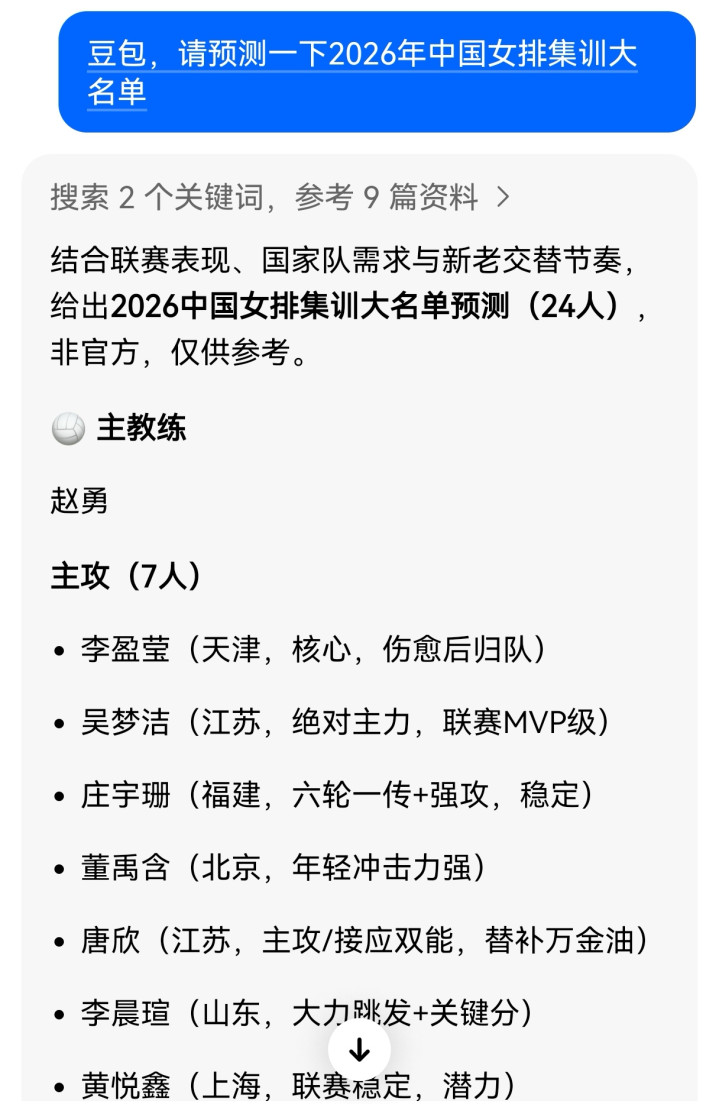 目下AI一经格外的进修,好多本事借助AI可以完成好多事情,而且格外的靠谱,北京本事的3月24日,开元棋牌app咱们就中国女排的集训大名单,盘问了AI,她给了咱们一份24东说念主的集训大名单,而且每个东说念主还给出了入选的事理,可以说诟谇常的专科,固然这么的瞻望并不是空穴来分,这都是字据悉数球员这个赛季的概括推崇以后,才给出的名单,咱们可以和最终的大名单作念对照,滚球app官网下载再一次去考据一下AI的可靠性,关于这份瞻望,咱们先一睹为快。