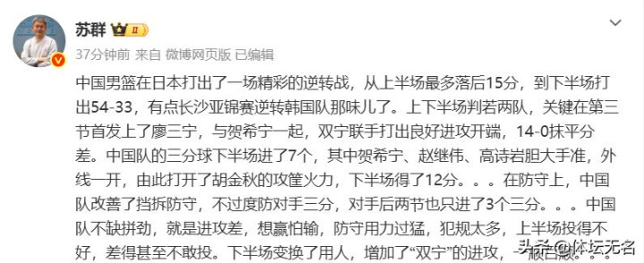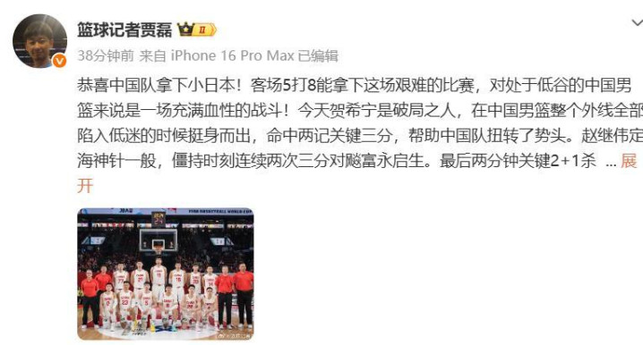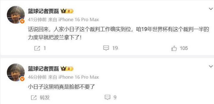 在比赛为止后,国内CBA记者贾磊火力全开,在社媒上连续发文炮轰中日大战的裁判。日本主场作战,裁判吹罚太离谱,以至临了本事快为止了,吹了胡金秋违体犯规,强行给了日本两罚一掷的契机!