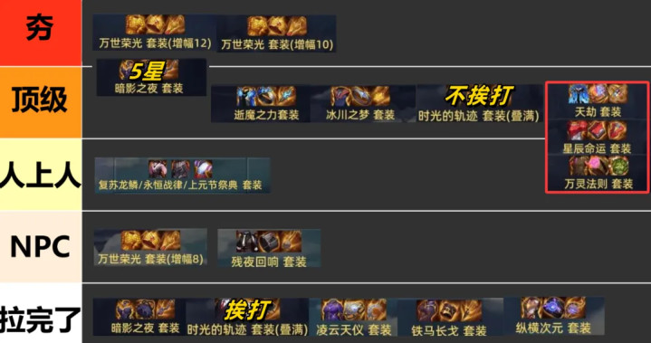 “万世套”,定位很浅薄土豪专属,唯有你有全身红10以上,那么其他套装皆备可以忽略,径直无脑上万世荣光就可以了!