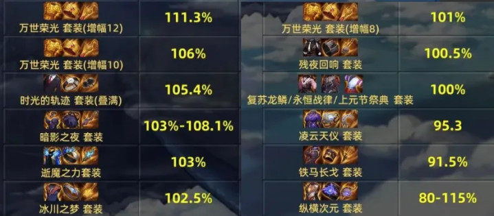 80版块这15套装备差距挺小的,天然“红12万世套”一家独大,但红12玩家毕竟仅仅少量数,至于其他套装基本上都在5%差距以内!