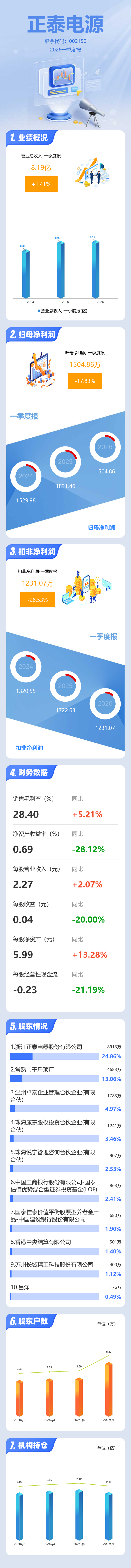 证券之星音信,正泰电源2026年一季报浮现,一季度公司主营收入8.19亿元,同比上涨1.41%;归母净利润1504.86万元,同比下跌17.83%;扣非净利润1231.07万元,同比下跌28.54%;欠债率55.14%,滚球官网投资收益98.11万元,财务用度2118.89万元,毛利率28.4%。