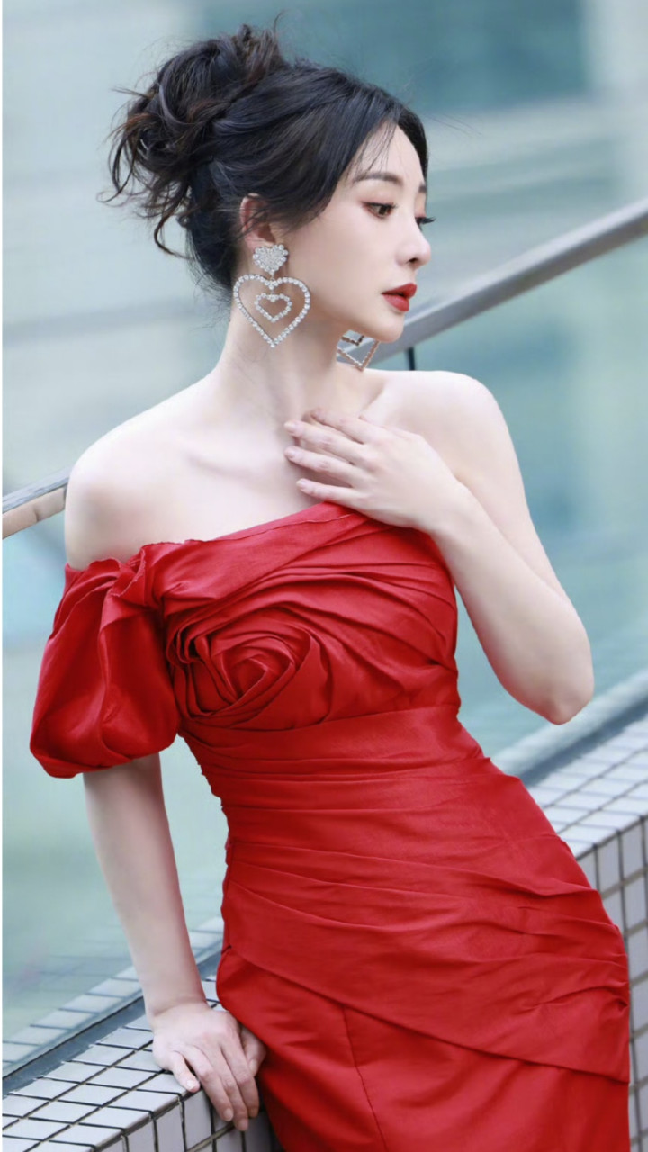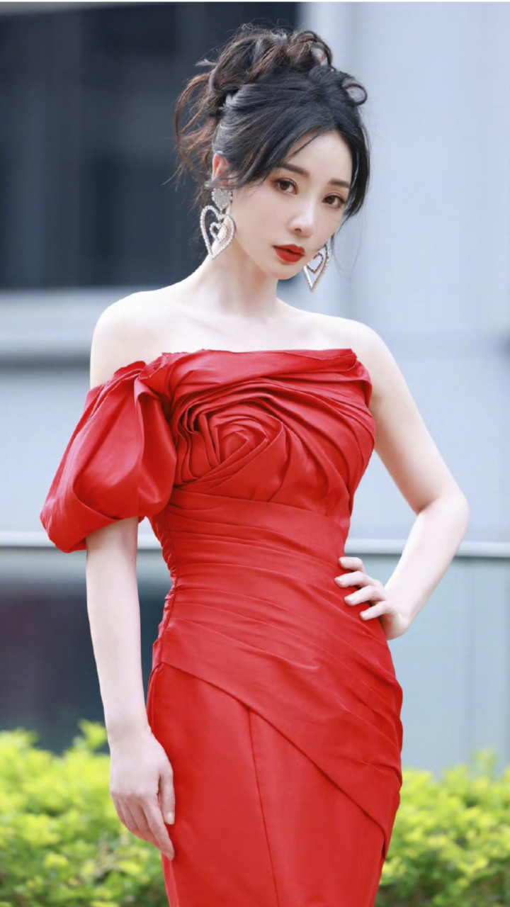 这款服饰除了能够将人的身型完美展现出来,最为出彩的就是胸前形成玫瑰花的图形,非常引人入目。柳岩的身型比较傲人,无论穿什么都能够将服饰的形体展现出来。