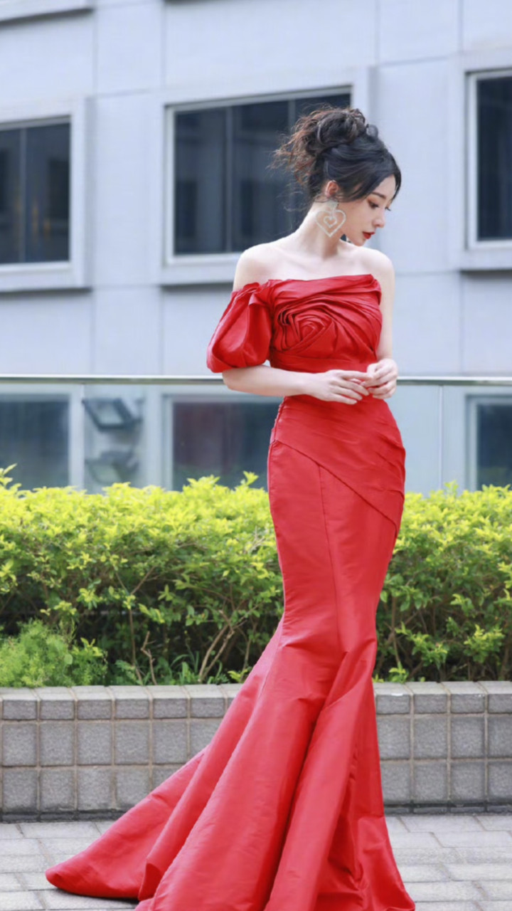 这是一款红色抹胸鱼尾拖尾礼服裙,也可称为红玫瑰造型礼服。 抹胸设计搭配不对称的立体玫瑰装饰,收腰剪裁勾勒出身体曲线,下半部分是鱼尾裙摆并带有拖尾,尽显优雅与华贵。