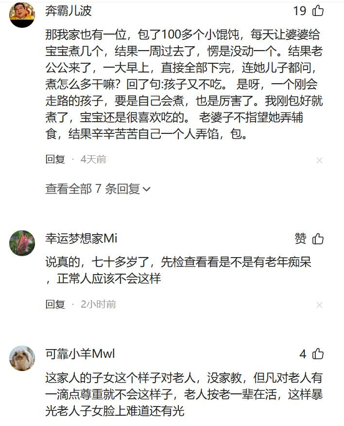 有网友说,这家东谈主的子女这个状貌对老东谈主,没家教,凡是对老东谈主有一滴点尊重就不会这状貌,老东谈主按老一辈在活,这样暴光老东谈主子女脸上难谈还有光。