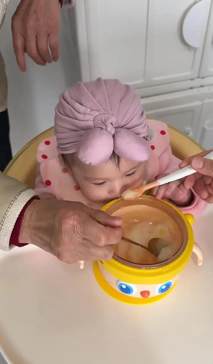 镜头中的婴儿巧合便是1岁傍边的状貌,母亲应该是给孩子用多样生果蔬菜肉泥作念成了的糊糊。女子眼中孩子的辅食却成了73岁婆婆眼中舌尖上的好菜。
