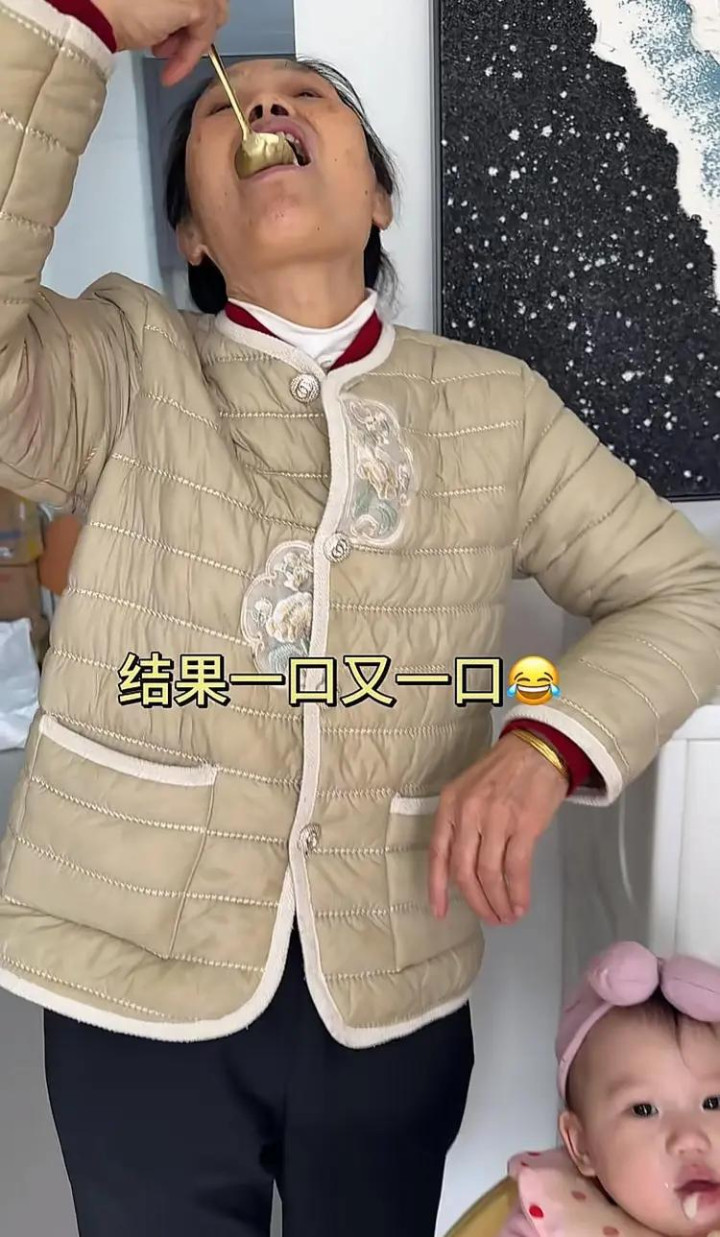 站在一旁的老少孩,女子的婆婆看着宝宝吃得饶有道理,想尝尝宝宝食品的逸想冲冲欲动,于是便提起勺子挖了一大口,仰头放进了我方的嘴里,吃完还把勺子无私地嗦了一遍。