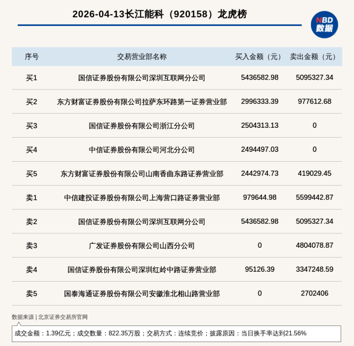 每经讯,2026年4月13日,北交所上市公司长江能科(920158,收盘价:17.4元)登上龙虎榜,往复姿色是运动竞价,滚球app下载败露原因是当日换手率达到21.56%,成交数目822.35万股,成交金额1.39亿元。买一席位为国信证券股份有限公司深圳互联网分公司,买入543.66万元;卖一席位为中信建投证券股份有限公司上海营口路证券贸易部,卖出559.94万元。